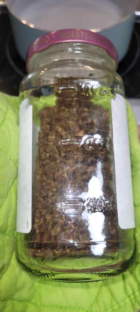 6. When your flower is properly browned, take the jar out of the oven and let it sit for a few minutes, just to cool it down enough to work with. Once cool, add all your butter to the jar and give it a nice shake. Put the jar in the pot when the water is at 160f – 180f. If you put the jar in the pot before the water is hot, you risk breaking the jar and having to start all over. Nobody wants to eat glass shards!