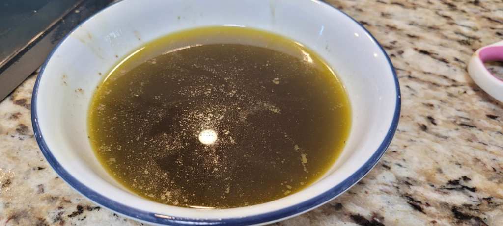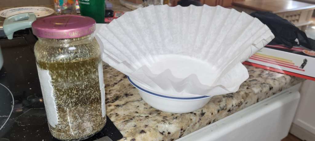 8. When your timer goes off, remove the jar from the water and let cool for a few minutes. Once cooled enough to handle, open the jar and strain the butter into a jar or glass bowl through your coffee filter (or t shirt) to separate the good butter from the flower. Some people eat this used flower, I throw it away. It doesn’t taste the best, in my opinion!